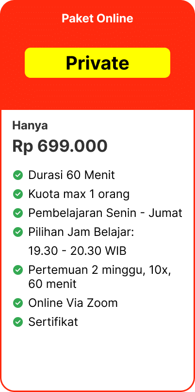 Di Kelas Online Interpeace, belajar bahasa Inggris jadi lebih mudah dan fleksibel tanpa harus datang ke Kampung Inggris, Pare. Dengan kurikulum yang terstruktur, kamu bisa langsung mulai berbicara dalam sehari sesuai tema pembelajaran.
