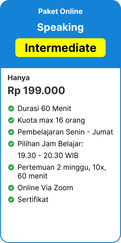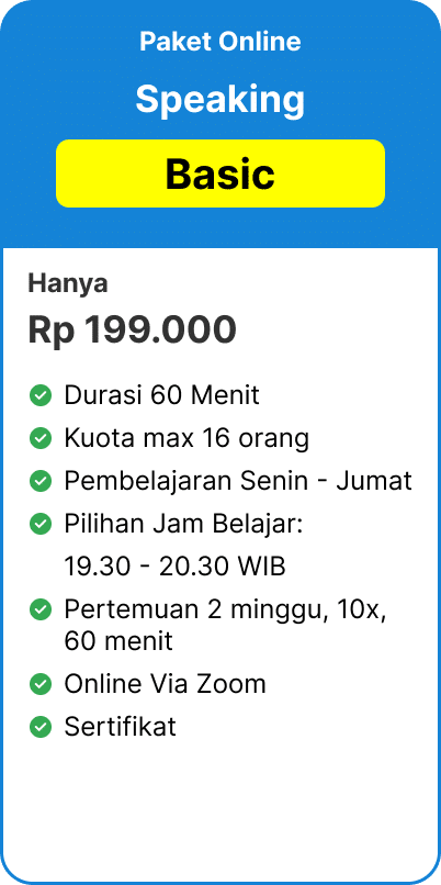 Melalui pertemuan langsung secara Online dan dibimbing oleh pengajar muda, asik dan kompeten. Dengan 90% Praktik Speaking di Setiap Kelas, peserta dapat melatih kemampuan Speaking, menajamkan Pronounciation, dan membangun kepercayaan diri dalam berbicara Bahasa Inggris. Mari gabung Program Kursus Online Interpeace Kampung Inggris Pare